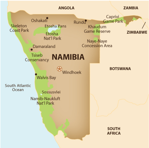 No vaccinations are mandatory unless arriving from a yellow fever risk country. Malaria prophylaxis may be recommended for Etosha, the Zambezi Region (Caprivi Strip), and northern areas.